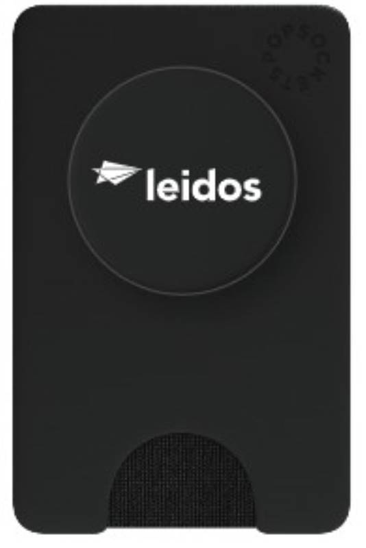 The PopSockets® pop wallet plus with black button, featuring the Leidos logo combines style and functionality. This versatile wallet is designed to simplify your life, offering a secure and stylish solution for carrying cards, cash, and even your PopSocket® grip.